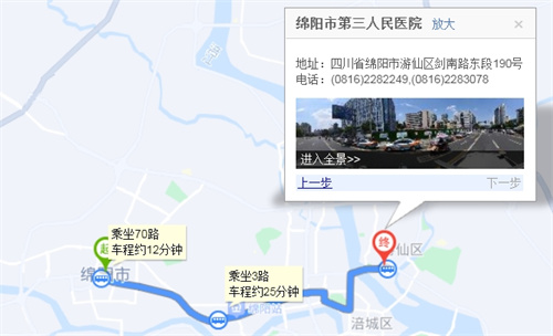 3路三醫(yī)院站下車步行 90米71路→35路1小時(shí)3分鐘9.6公里步行480米綿陽市步行 390米火炬大廈(火炬北路)站上車71路七星樓站下車七星樓站 上車35路三醫(yī)院站下車步行 90米
