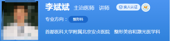 醫(yī)生介紹:李斌斌是主治醫(yī)師,講師,畢業(yè)于北京醫(yī)科大學,在整形美容行業(yè)工作了27年。一直堅持安全、適度、自然、協(xié)調的手術理念,尤其是在面部整形上,有著十分豐富的經驗,就職八大處整形醫(yī)院將近20年,有著上萬例手術經驗。還是中國整形美容協(xié)會健康智慧醫(yī)美分會第一屆理事會理事、中國職業(yè)安全健康協(xié)會醫(yī)美與整形安全專業(yè)委員會委員等。