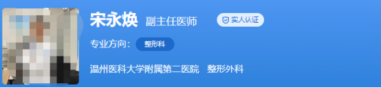 醫(yī)生介紹:宋永煥是副主任醫(yī)師,碩士研究生,在整形行業(yè)工作了15年,積累了豐富的臨床經(jīng)驗(yàn),還在韓國首爾大學(xué)進(jìn)修過。在sci上發(fā)表了十多篇的論文。