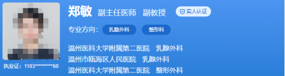 醫(yī)生介紹:鄭敏是副主任醫(yī)師,副教授,擁有博士學(xué)位。是以人才引進(jìn)的方式來溫州工作的。在胸部整形方面有著十分豐富的經(jīng)驗(yàn),面部年輕化上也有很深的造詣。還獲得過吉林省科技進(jìn)步三等獎(jiǎng),還在國家和省級(jí)的雜志上發(fā)表了10多篇論文。