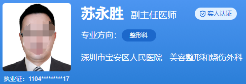 醫(yī)生介紹:蘇永生醫(yī)生是一名副主任醫(yī)師。他于2009年畢業(yè)于華中科技大學(xué)附屬同濟(jì)醫(yī)學(xué)院。畢業(yè)之后,他一直在深圳市寶安區(qū)人民醫(yī)院做整形手術(shù)。到目前為止,他已經(jīng)獲得了專業(yè)主治醫(yī)師的資格證書,并在工作期間以優(yōu)異的成績(jī)獲得了博士學(xué)位,并在日本和上海第九人民醫(yī)院學(xué)習(xí)。到目前為止,已經(jīng)有很多成功的手術(shù)案例,發(fā)表了很多學(xué)術(shù)論文。