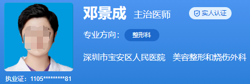 醫(yī)生介紹:鄧景成,畢業(yè)于上海交通大學(xué),獲得醫(yī)學(xué)碩士學(xué)位。自畢業(yè)以來從事整形科已有多年時(shí)間,有許多成功的手術(shù)案例。他擅長(zhǎng)各種眼鼻整形手術(shù)和下領(lǐng)角整形手術(shù),尤其是在眼部、鼻部美容整形方面有獨(dú)到的設(shè)計(jì)經(jīng)驗(yàn)和效果。此外,他還在整形科領(lǐng)域發(fā)表多篇學(xué)術(shù)論文,獲得業(yè)界的廣泛認(rèn)可。