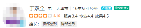 醫(yī)生介紹:于雙全是副主任醫(yī)師,博士,在整形行業(yè)工作了16年,無論是經驗,還是技術都十分的完善。還是美國射極峰公司亞洲首批高級特聘專家、美國射極峰純膨體中國指定臨床手術專家。