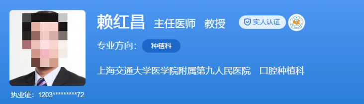醫(yī)生介紹:賴紅昌是上海九院口腔科的教授,長(zhǎng)期從事口腔醫(yī)學(xué)及口腔種植學(xué)專業(yè),臨床經(jīng)驗(yàn)豐富,擅長(zhǎng)微創(chuàng)種植、前牙美學(xué)種植、即刻種植即刻修復(fù)等疑難病例的診治。在口腔種植學(xué)的臨床與基礎(chǔ)研究中,他對(duì)種植區(qū)軟組織美學(xué)、種植體新型材料及表面處理等有很高的研究水平。